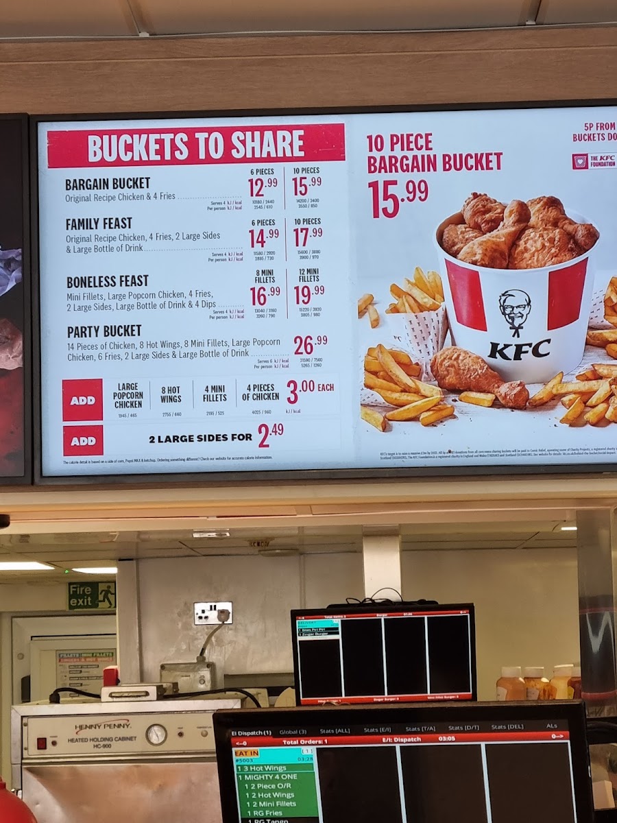 The menu structure typically includes meal deals, such as the "Mighty Bucket For One," which combines several chicken items with fries and a drink, catering to individual diners looking for a complete meal. The offerings are suitable for takeout and quick service dining, providing convenience for those seeking a fast, savory meal.